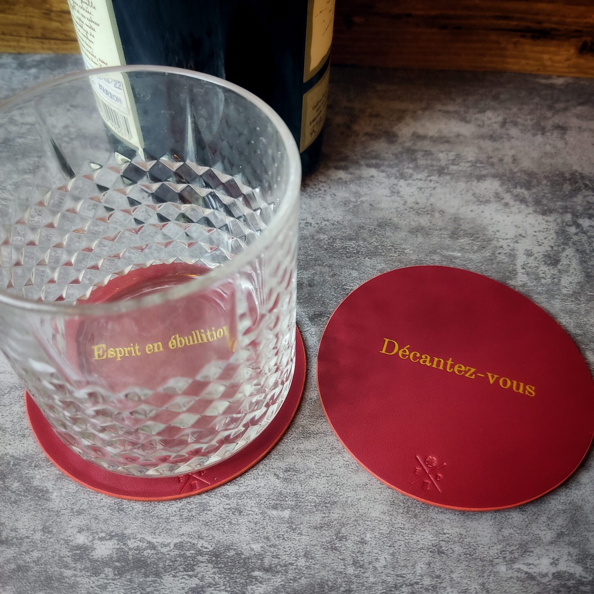 - Les marquages sont réalisés par dorure à chaud. Deux dessous de verre affichent « Décantez-vous », les deux autres, « Esprit en ébullition »